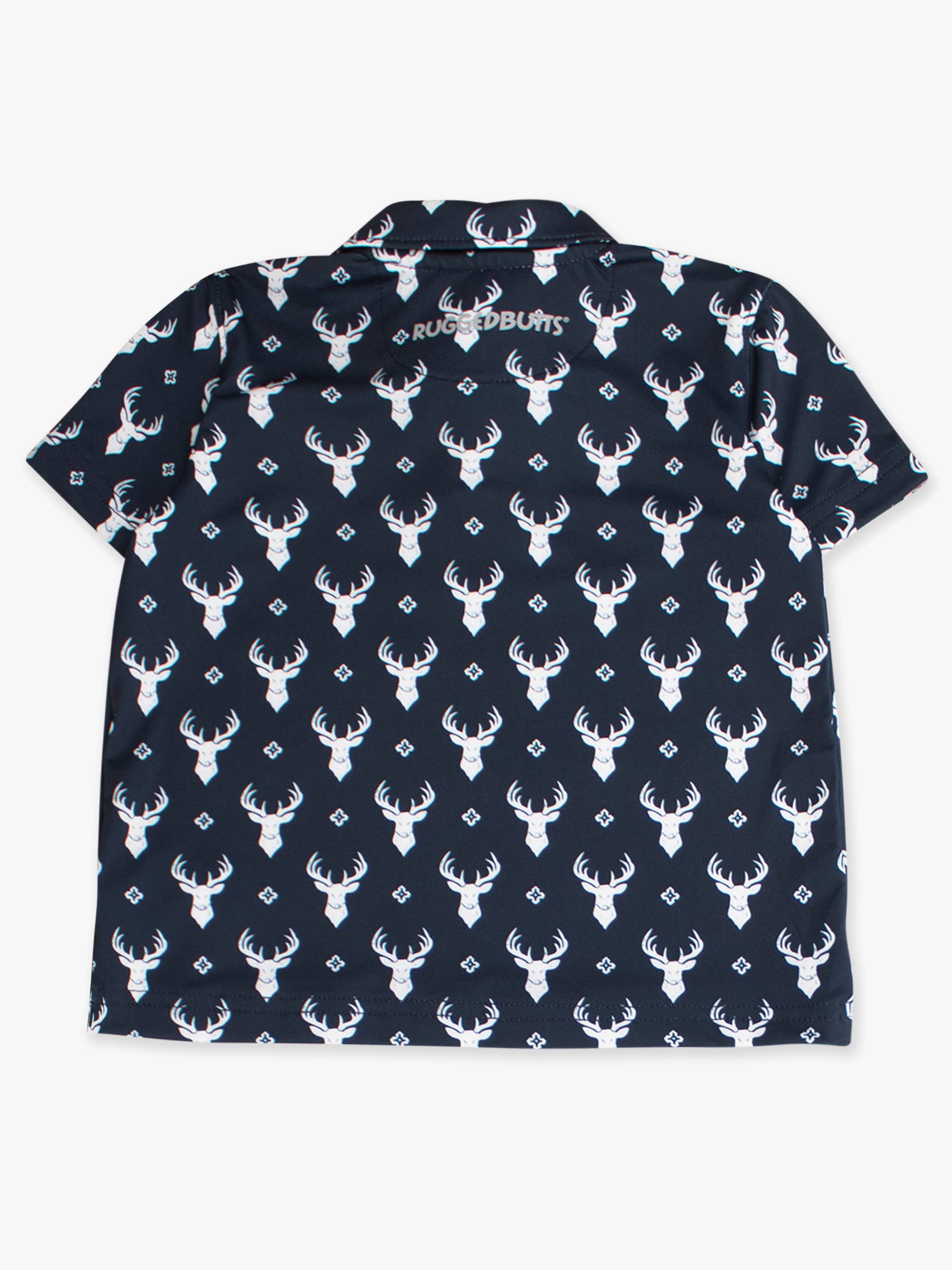 Made with stretch material, this polo is perfect for the active little guy. Bold stag heads repeat in a clean tile pattern against a rich navy background. Perfect for boys who love hunting and the great outdoors, this classic print brings rugged style to any look. Pairs well with Dark Navy, White. Care Instructions: Machine wash cold; only non-chlorine bleach when needed; tumble dry low Fabric Content: 90% Polyester,10% Spandex Reference Code: B1282