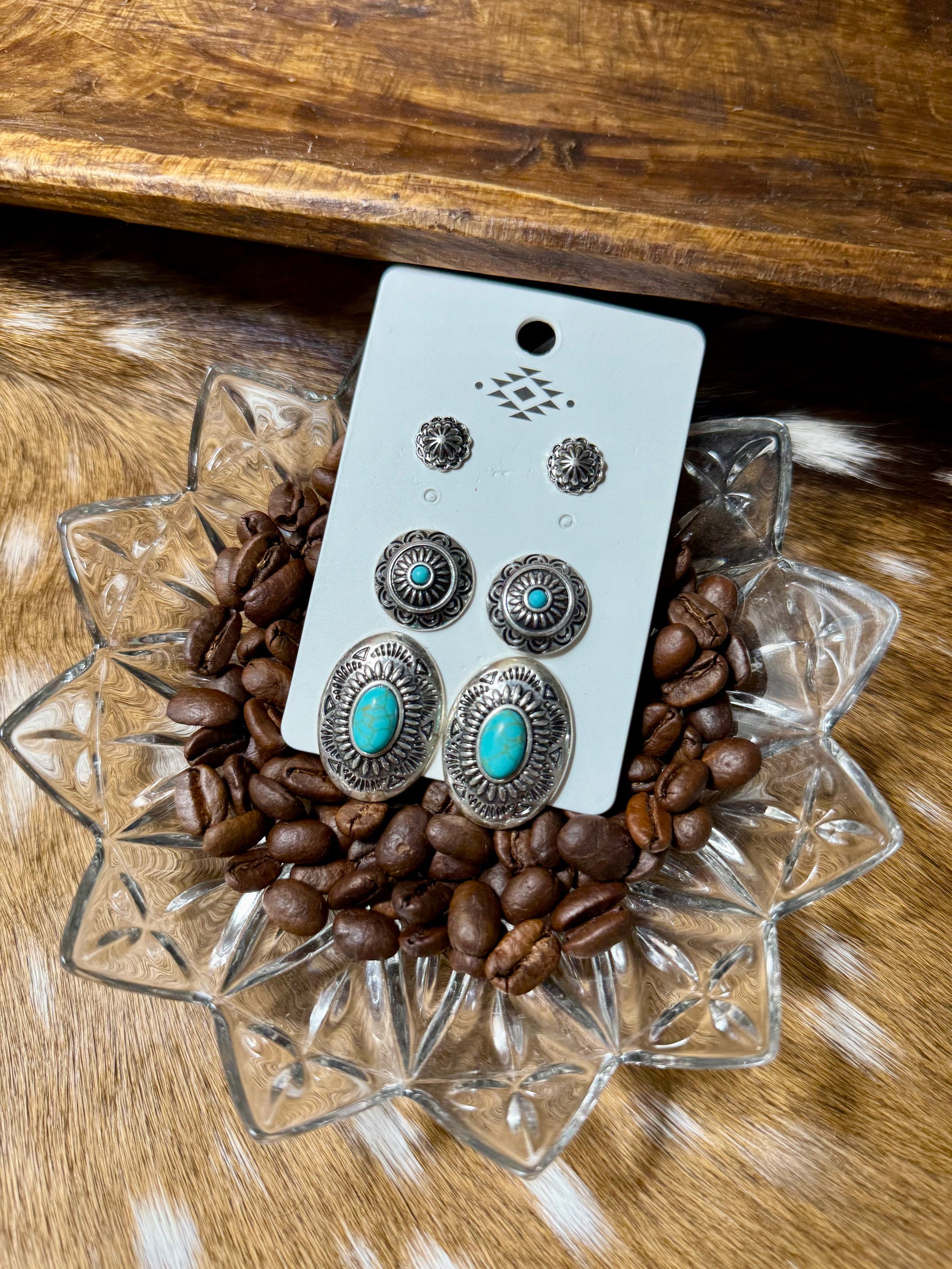 Triple Stud - Turquoise is a stunning piece of jewelry featuring three turquoise studs. With its unique design, this accessory adds a touch of sophistication and style to any outfit. Made from high-quality materials, it is durable and long-lasting. Elevate your look with this beautiful and versatile triple stud.